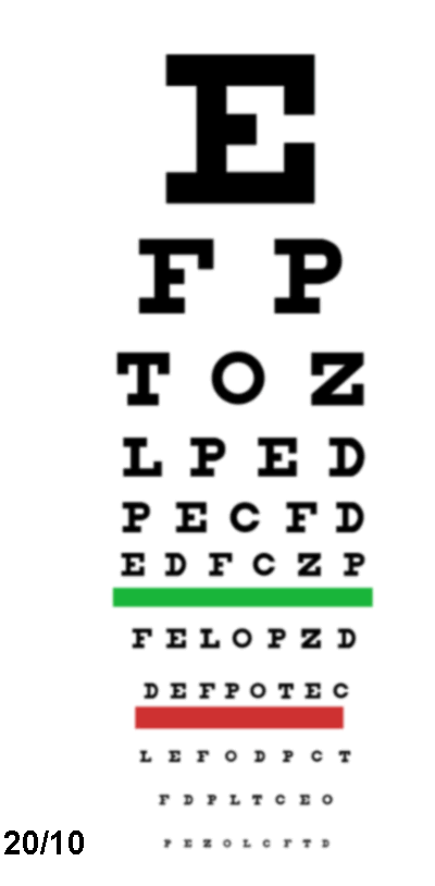 20/10: A patient standing 20 feet from an object sees it as clearly as an average person standing 10 feet from the object. Great vision.