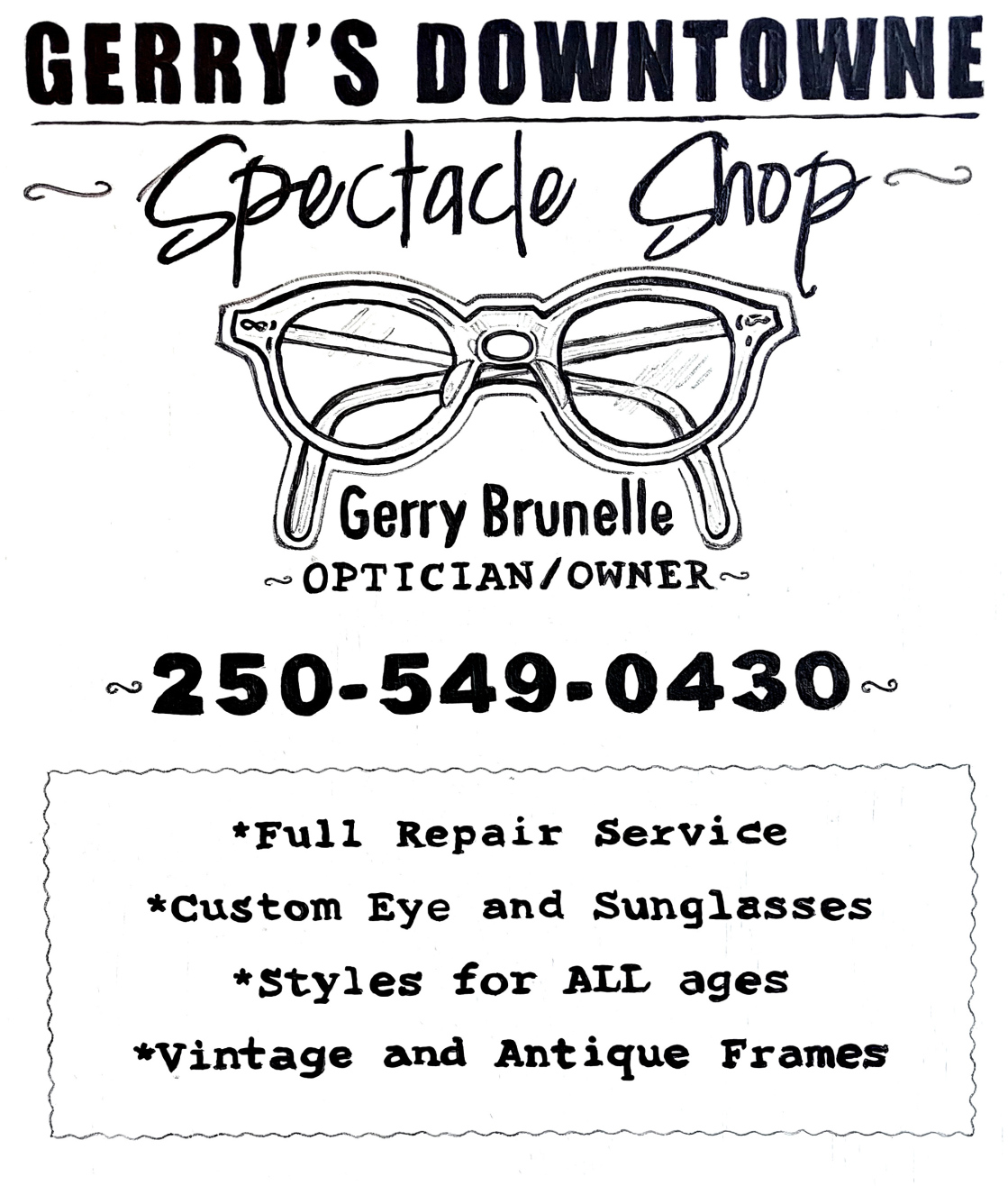 Gerry Brunelle bought his business twenty years ago from Christine Wejr, but has been the heart and soul of free eyeglass repairs and the friendliest of service in the Vernon community for much longer. Now, ownership of the store has transferred again, to Nicholas Rudersdorfer. While Gerry's planning to keep working at the shop for the forseable future, he's keen on having a bit more free time to play music, make art, and enjoy life.